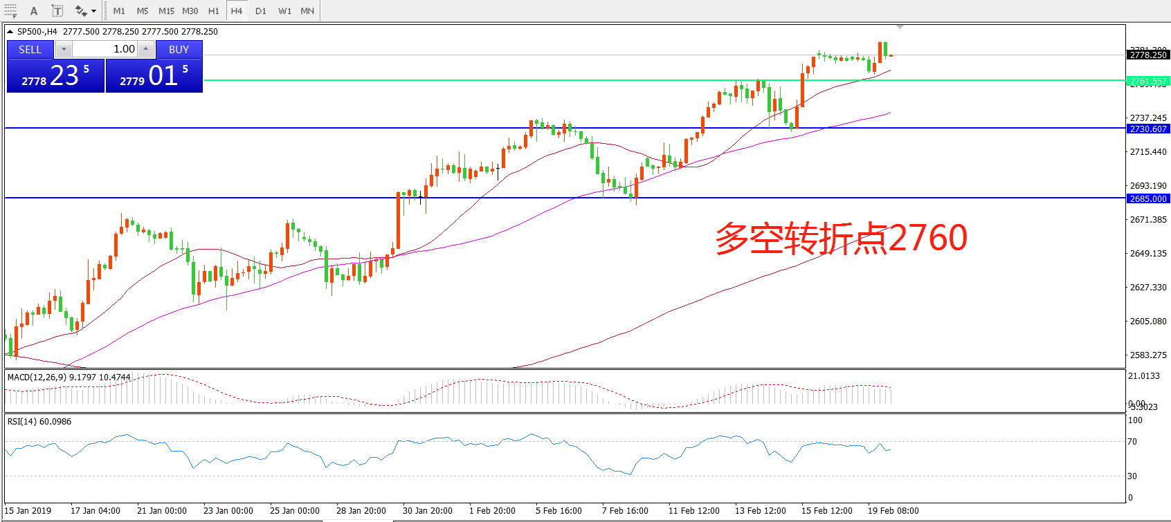 4小时图看,SP500高位震荡后依然呈现明显的上升趋势状态,21均线成为短线支撑,MACD红柱增加,延续涨势是大概率事件。