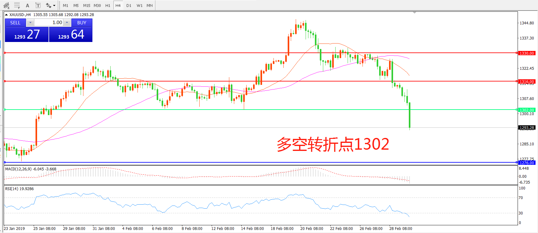 4小时图看,金价长阴下破,跌破1302一线支撑后,整体走势偏空。MACD绿柱增加,RSI指标掉头向下,日内延续下行概率较大。