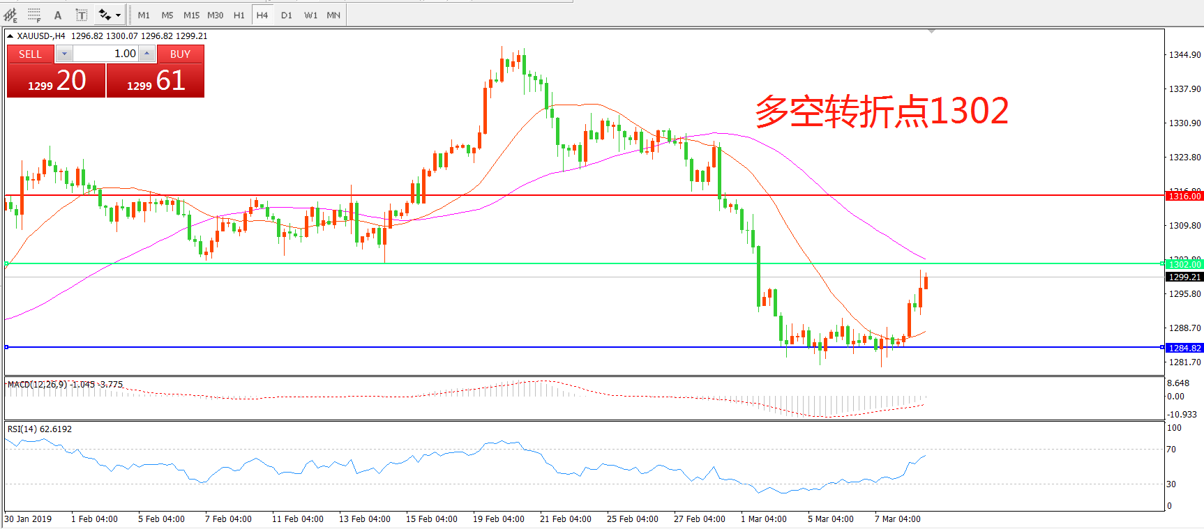 4小时图看,金价近期高位回落后,周五中阳反弹,收复近一周失地,整体走势相对强势。21均线逐渐拐头, MACD绿柱缩短,RSI指标有拐头迹象,整体走势偏强,重点关注上方1300附近阻力,如能顺利突破,金价将迎来新的一波反弹。