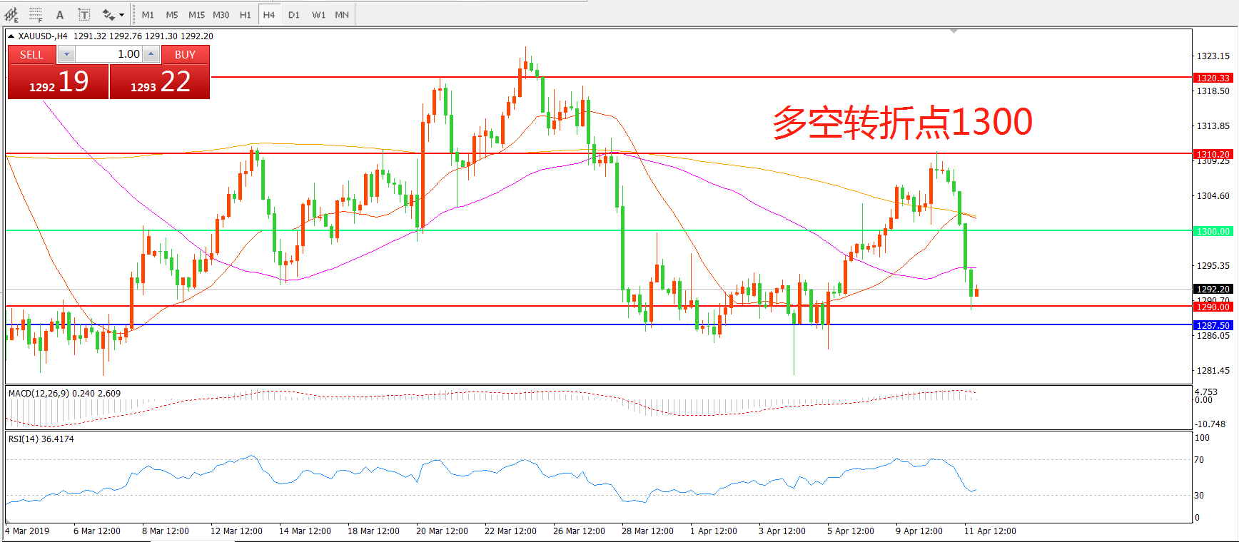 现货黄金周四(4月11日)大跌,美市盘中最低下探至1294.54美元/盎司,几乎失去连续三日的涨幅,重返1300关口下方。