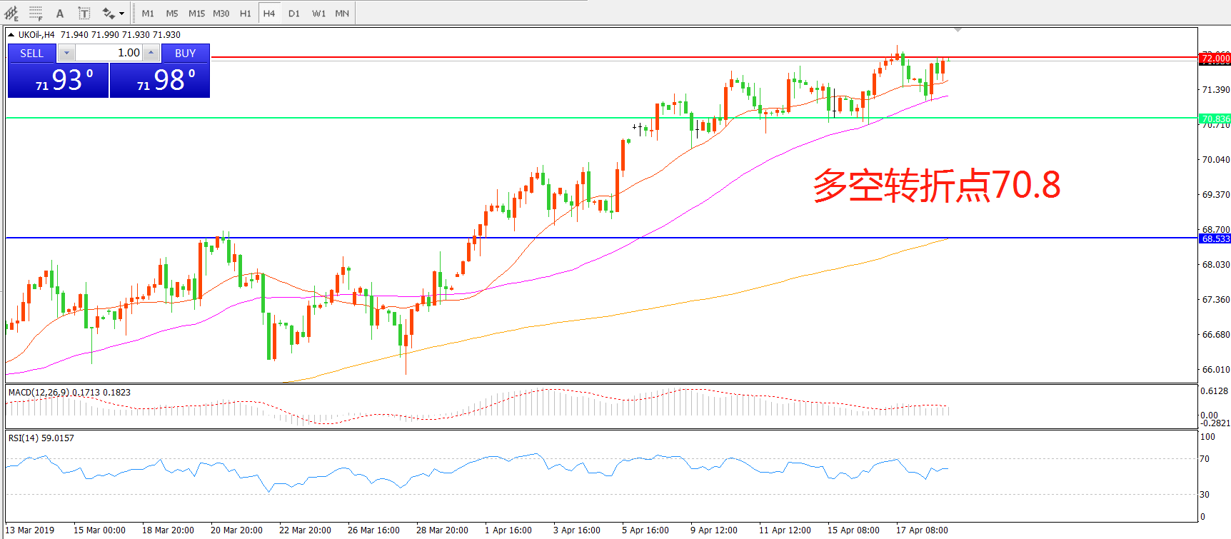 由于4月19日为欧美耶稣受难日假期,全天休市。多数市场参与者已经开始长周末假期。美国石油活跃钻井数下降为油价提供一定支撑,但减产行动的不确定性以及美国对伊朗制裁的执行程度均令油价涨势遭受抑制。布伦特原油周四(4月18日)小幅收涨,报71.93美元/桶。