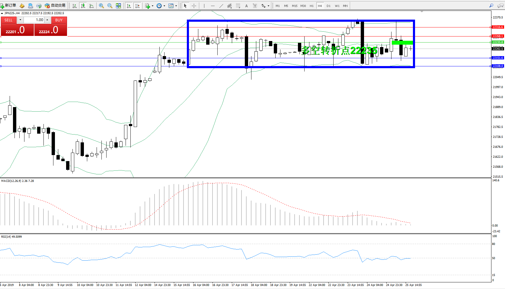 技术点评:继续维持矩形宽幅震荡,行情正试图寻找方向破位,布林带指标通道内部整理,MACD指标回归0轴附近徘徊,RSI指标50均衡线整理;