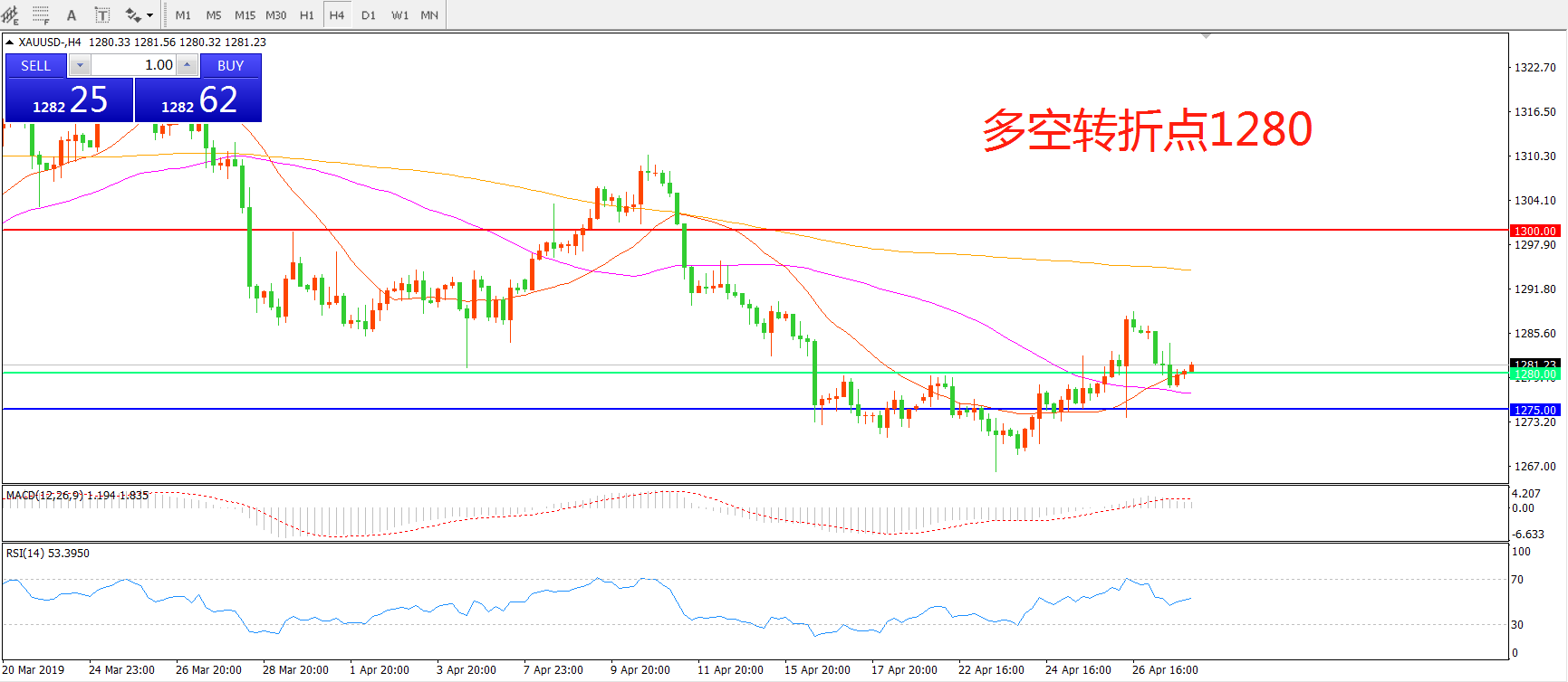4小时图看,金价触及1275支撑强势反弹,1280成为短期多空双方争夺焦点,MACD红柱增加,如ADP数据利好金价,1280企稳后,黄金有重新冲击1300的可能。