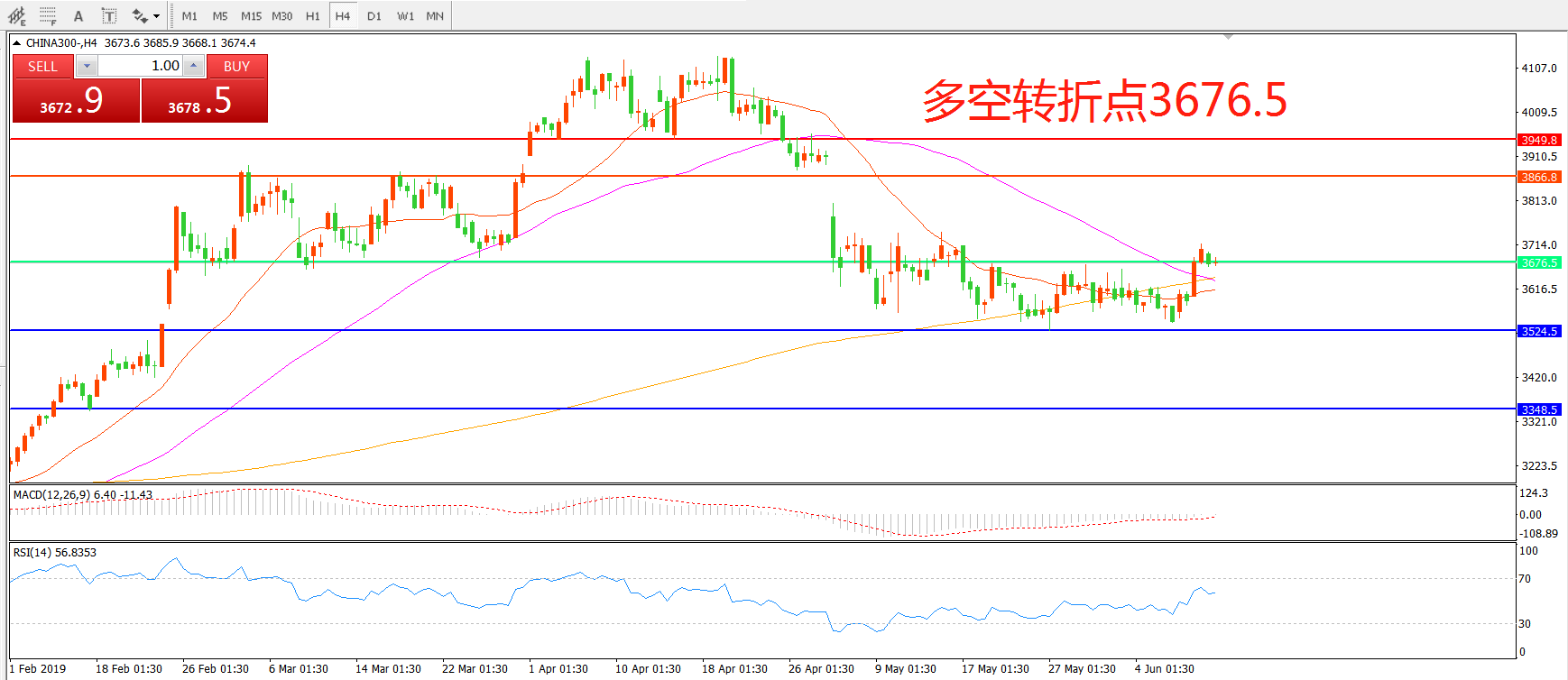 4小时图看,沪深300指数日连续盘整后阳线暴力拉升,整体走势有所回暖, 短期均线有拐头迹象,MACD绿柱缩短,RSI指标拐头向上,日内延续上行概率较大。