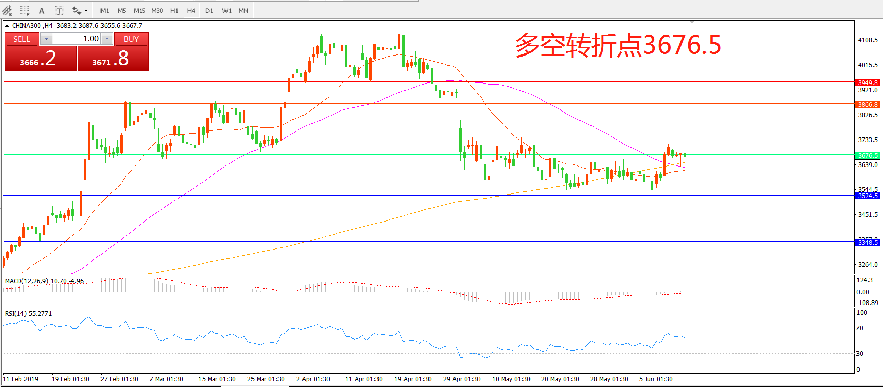 4小时图看,沪深300指数经过连续整理初步站稳3676.5一线,整体走势有所回暖,均线系统粘合形成下方支撑,MACD绿柱缩短,RSI指标拐头向下,日内延续上行概率较大。