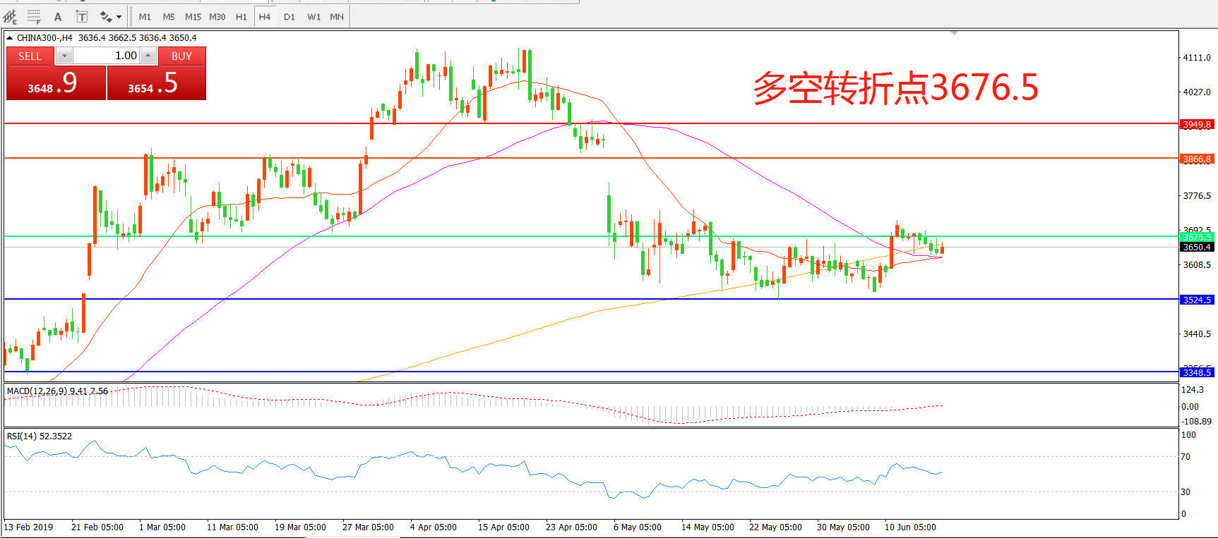 4小时图看,沪深300指数先涨后跌,依然维持3676.5一线整理,整体方向仍然偏空,均线系统粘合形成下方支撑,MACD绿柱缩短,RSI指标拐头向下,日内延续震荡概率较大。