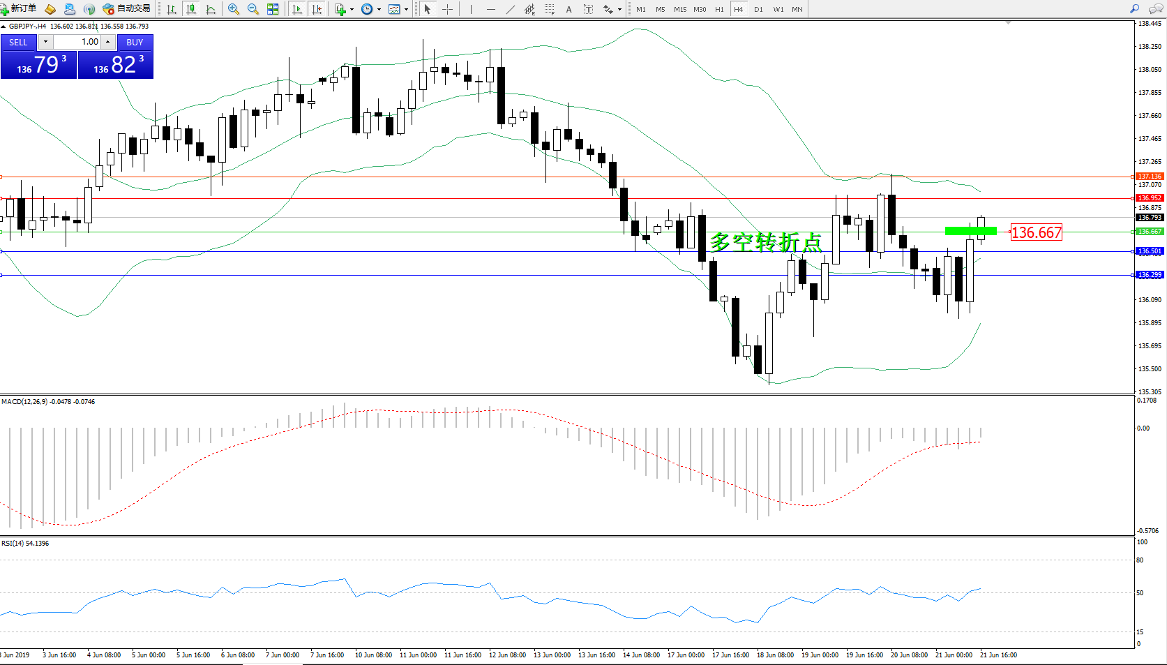 备选策略:136.667下方看跌,目标136.501、136.299