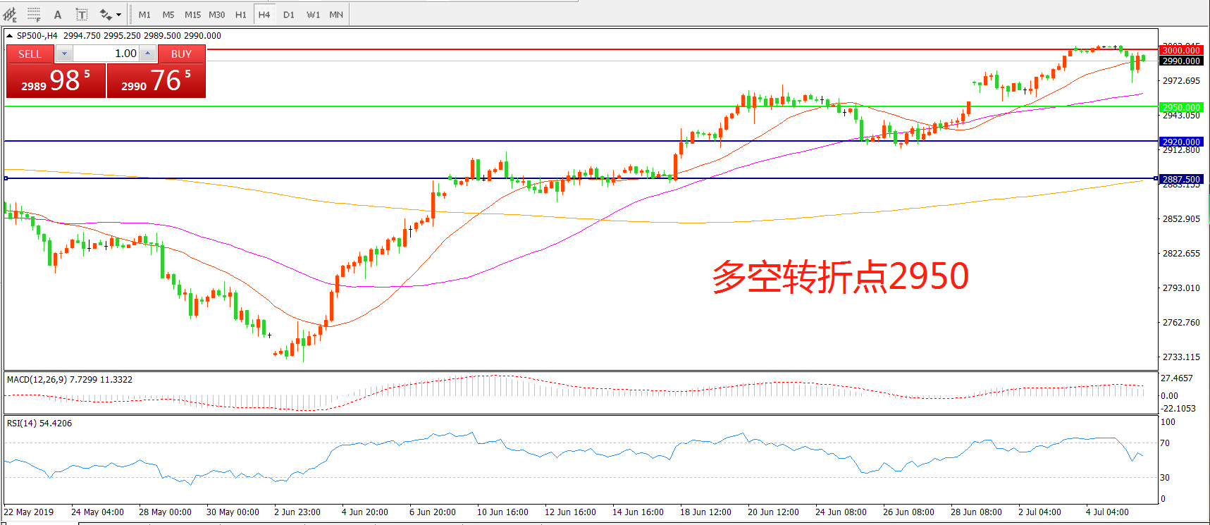 受美国联邦储备委员会降息预期和全球贸易紧张局势缓解带动,标普500上周累计上涨了1.65%,周五小幅下跌,最终收报2994.25点,大型科技股多数下跌,金融股全线上扬。Facebook跌0.41%,奈飞跌0.31%,微软跌0.29%,中概股普跌,趣头条大涨近12%。下周美联储主席鲍威尔将亮相国会参众两院金融服务委员会,就半年度货币政策报告作证词,或引发金融市场动荡,务必重点关注。