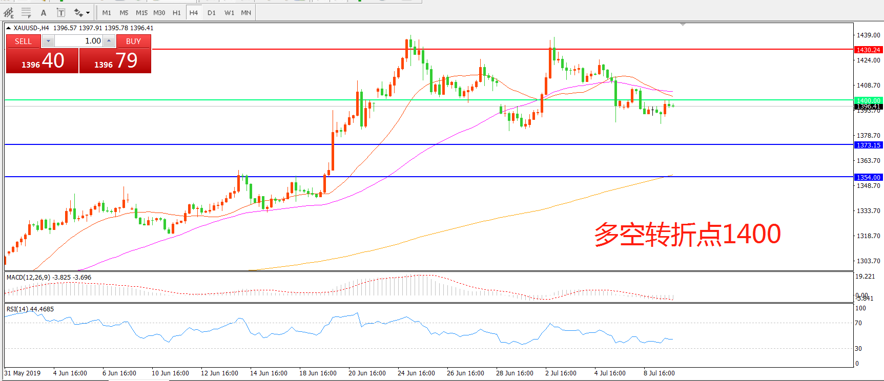 4小时图看,金价触碰1430附近回落后无力反弹,均线系统粘合形成上方阻力,1400成为短期多空分水岭,MACD绿柱增加,RSI指标向下,区间震荡概率较大。