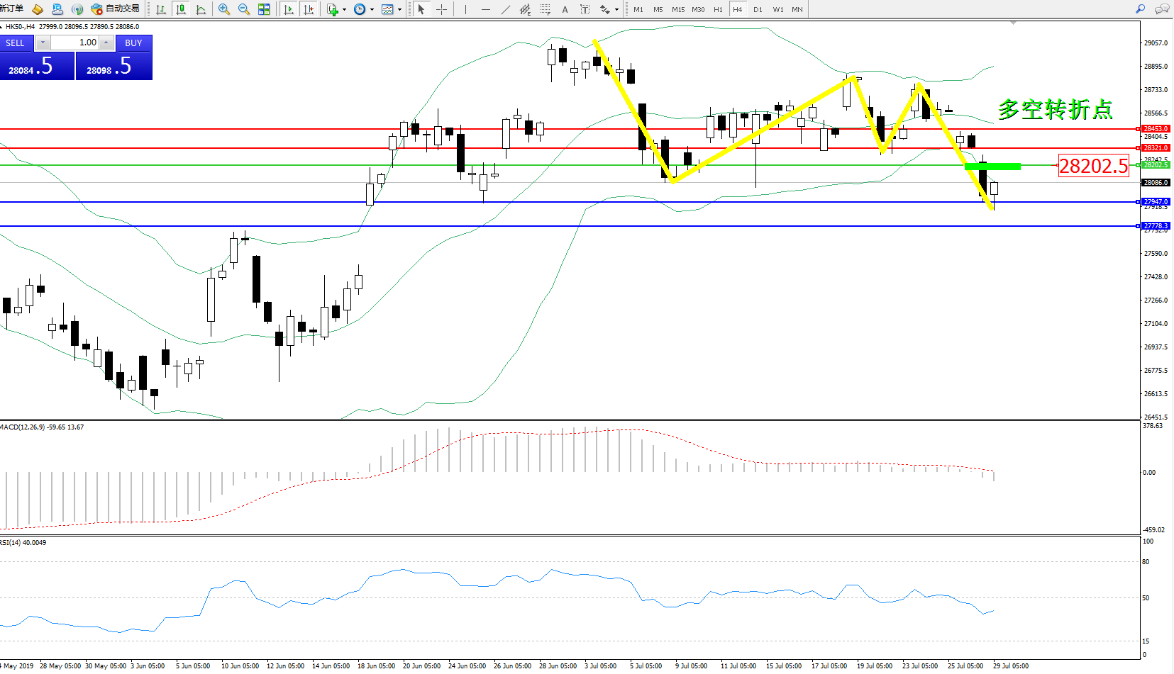 香港恒生指数7月29日(周一)收盘下跌291.33点,跌幅1.03%,报28106.41点;恒指跌幅扩大至1.4%失守28000点,创逾一个月新低。香港本地地产股、博彩股、金融股跌幅居前。恒指低走弱势持续下行,港股成交量处于萎缩,接连数日的香港动乱引发资本外逃影响,投资审慎气氛有明显减少。