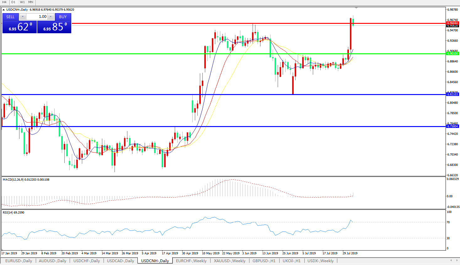 中美贸易谈判无进展,经贸磋商或长久延续,特朗普威胁在91日对中国3000亿产品加征关税,川普对国际贸易局势的相关言论,推送了市场的担忧情绪,再加上ISM制造业PMI数据放缓至近三年低点,美股大跌近1%再创一个月新低。美元人民币快速上攻,朝着7.0整数关口挺近。