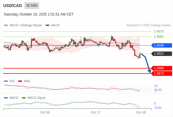 美元/加元 当日内 : 看跌,在 1.4040 之下。
