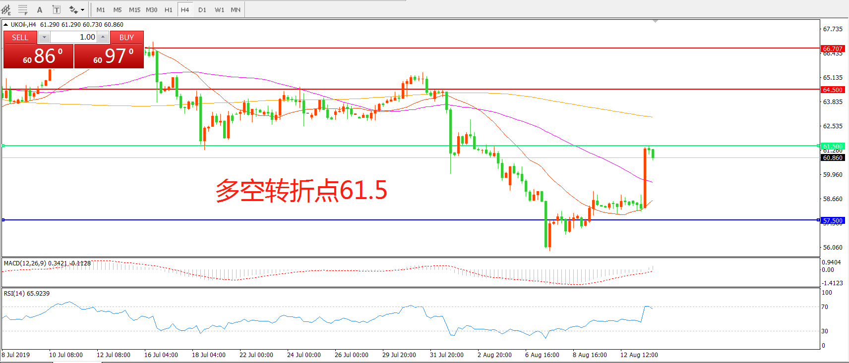 周二(8月13日),美国宣布将推迟对部分中国产品征收关税,并宣布双方同意继续进行贸易谈判。双方约定在未来两周内再次通话,金融市场瞬间掀起惊涛骇浪,美油布油双双大幅上涨,布伦特原油一度大涨逾4%,随后小幅回落,最终收报60.86美元/桶。