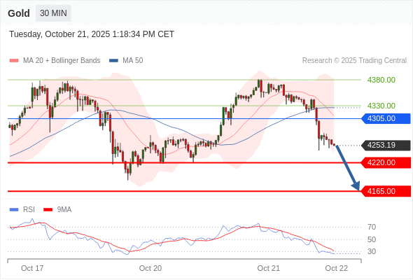 在 4305.00 之下,看跌,目标价位为 4220.00 ,然后为 4165.00 。