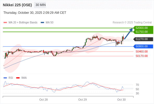 交易策略: 在 50800.00 之上,看涨,目标价位为 51750.00 ,然后为 52000.00 。