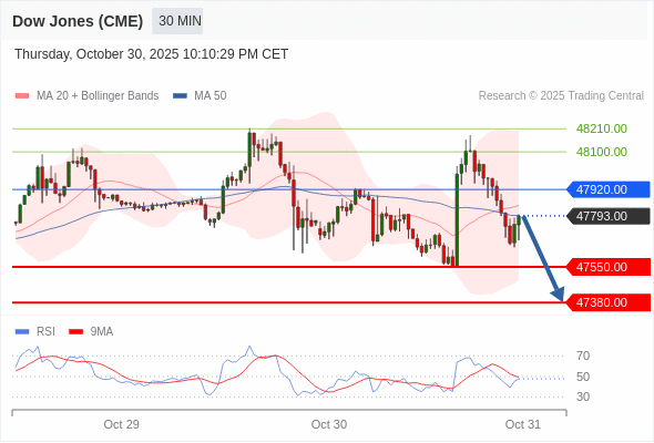 交易策略: 在 47920.00 之下,看跌,目标价位为 47550.00 ,然后为 47380.00 。
