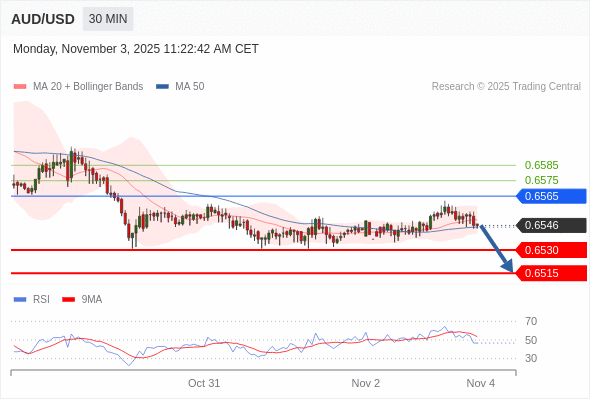 在 0.6565 之下,看跌,目标价位为 0.6530 ,然后为 0.6515 。