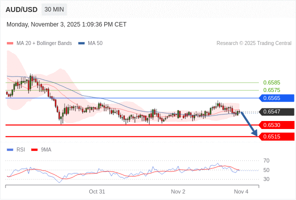 在 0.6565 之下,看跌,目标价位为 0.6530 ,然后为 0.6515 。