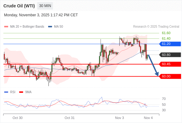 在 61.20 之下,看跌,目标价位为 60.45 ,然后为 60.00 。