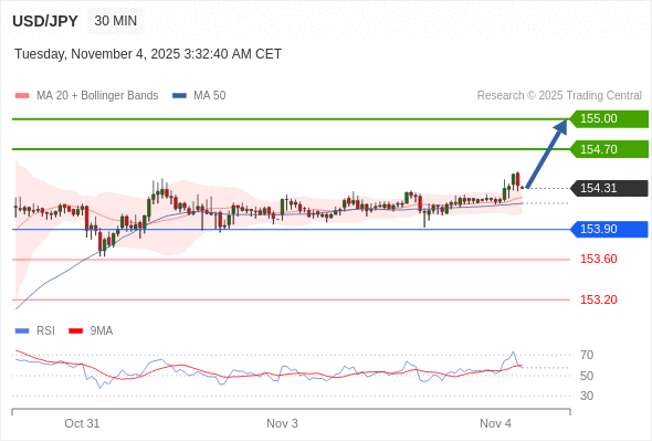 在 153.90 之上,看涨,目标价位为 154.70 ,然后为 155.00 。