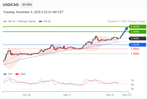 在 1.4030 之上,看涨,目标价位为 1.4095 ,然后为 1.4120 。