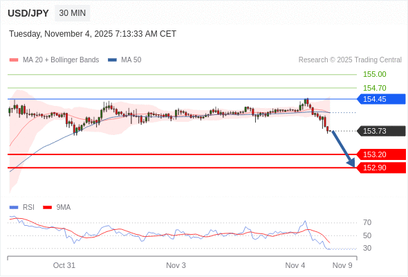 在 154.45 之下,看跌,目标价位为 153.20 ,然后为 152.90 。