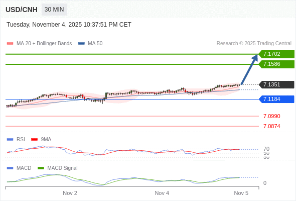 备选策略: 如跌破 7.1184 ,USD/CNH 目标方向定在 7.0990 和 7.0874 。