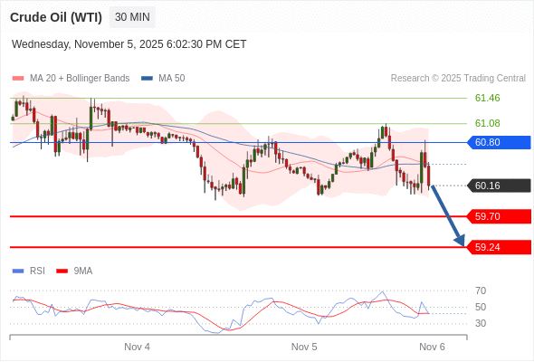 在 60.80 之下,看跌,目标价位为 59.70 ,然后为 59.25 。