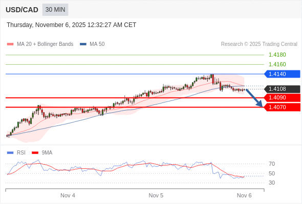在 1.4140 之下,看跌,目标价位为 1.4090 ,然后为 1.4070 。
