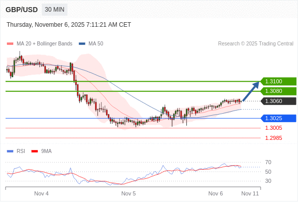 在 1.3025 之上,看涨,目标价位为 1.3080 ,然后为 1.3100 。