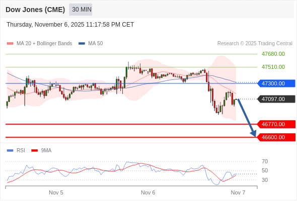 在 47300.00 之下,看跌,目标价位为 46770.00 ,然后为 46600.00 。