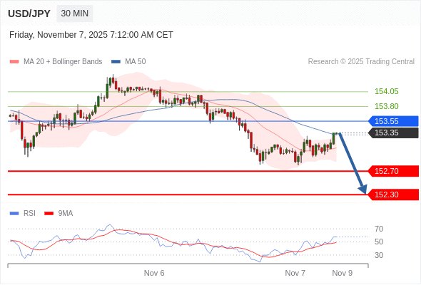 在 153.55 之下,看跌,目标价位为 152.70 ,然后为 152.30 。