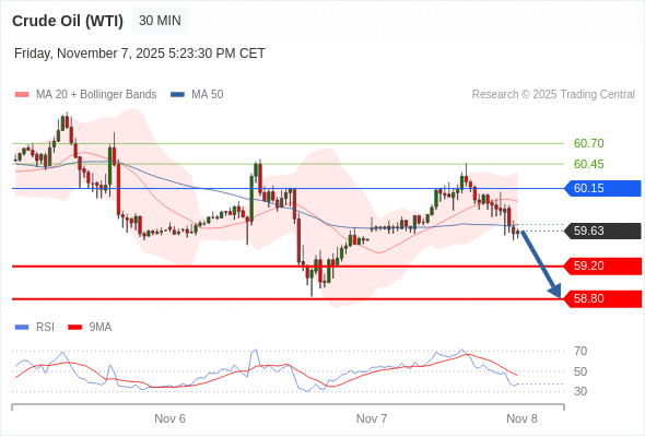 在 60.15 之下,看跌,目标价位为 59.20 ,然后为 58.80 。