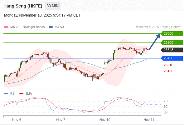 香港恒生指数期货 当日内: 超短线(当日内)支撑位在26460附近。