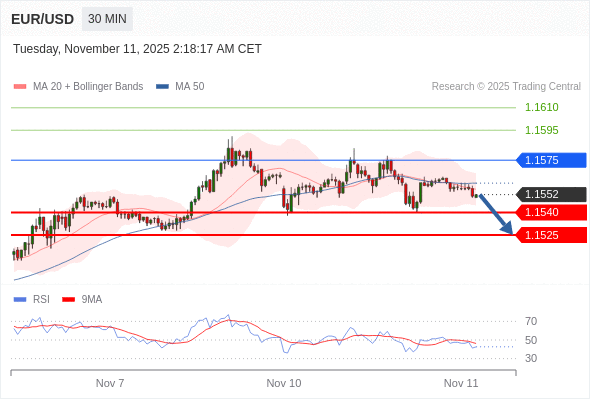 在 1.1575 之下,看跌,目标价位为 1.1540 ,然后为 1.1525 。