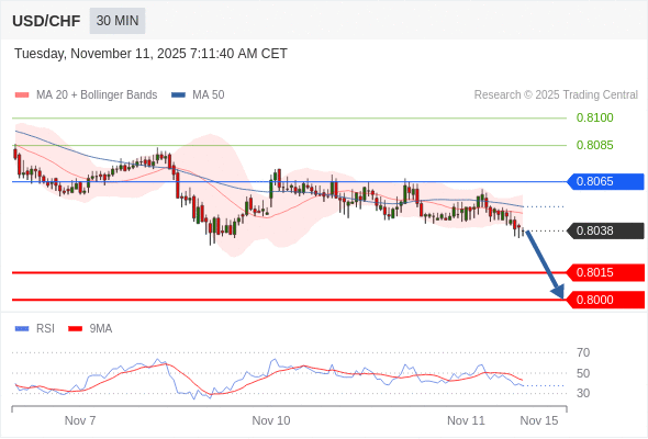 在 0.8065 之下,看跌,目标价位为 0.8015 ,然后为 0.8000 。