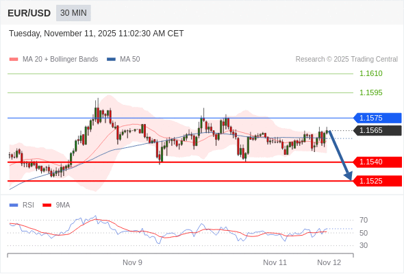 在 1.1575 之下,看跌,目标价位为 1.1540 ,然后为 1.1525 。