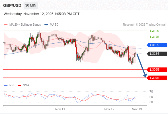 在 1.3180 之下,看跌,目标价位为 1.3095 ,然后为 1.3075 。