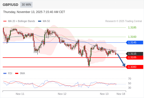 在 1.3145 之下,看跌,目标价位为 1.3105 ,然后为 1.3080 。