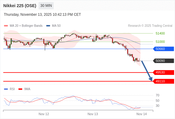 交易策略: 在 50660 之下,看跌,目标价位为 49530 ,然后为 49110 。