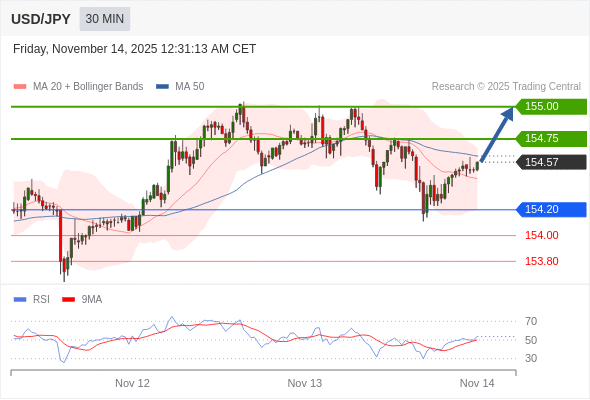 在 154.20 之上,看涨,目标价位为 154.75 ,然后为 155.00 。