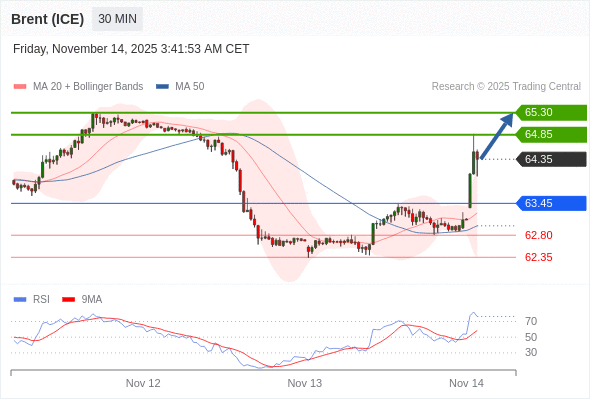 在 63.45 之上,看涨,目标价位为 64.85 ,然后为 65.30 。