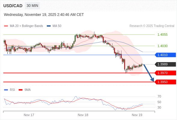 在 1.4010 之下,看跌,目标价位为 1.3970 ,然后为 1.3950 。