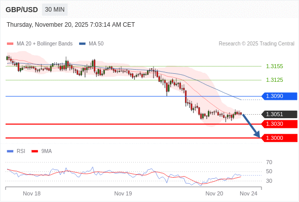 在 1.3090 之下,看跌,目标价位为 1.3030 ,然后为 1.3000 。