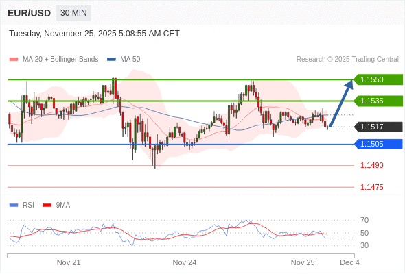在 1.1505 之上,看涨,目标价位为 1.1535 ,然后为 1.1550 。