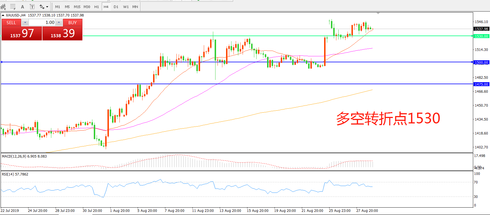 周三(8月28日)美国总统特朗普最新发推称,美联储“精神上”无法跟上其他国家的步伐。他在推文中写道,“在法国举行的G7会议上,所有其他国家的领导人都为自己的利率成本之低而感到头晕目眩。德国借钱实际上是“有报酬的”。”近期以来,特朗普加大了对美联储的抨击力度,几乎每日都向美联储实施口头“轰炸”。特朗普昨日表示,美联储乐于见到美国经济基石处于挣扎之中,且这也是美联储维持相对鹰派立场的原因。在特朗普的影响下,美元走强,金价维持高位震荡,最终收报1538.63美元/盎司。全球央行宽松,英国硬脱欧等因素依然是金价上行的有力支撑。