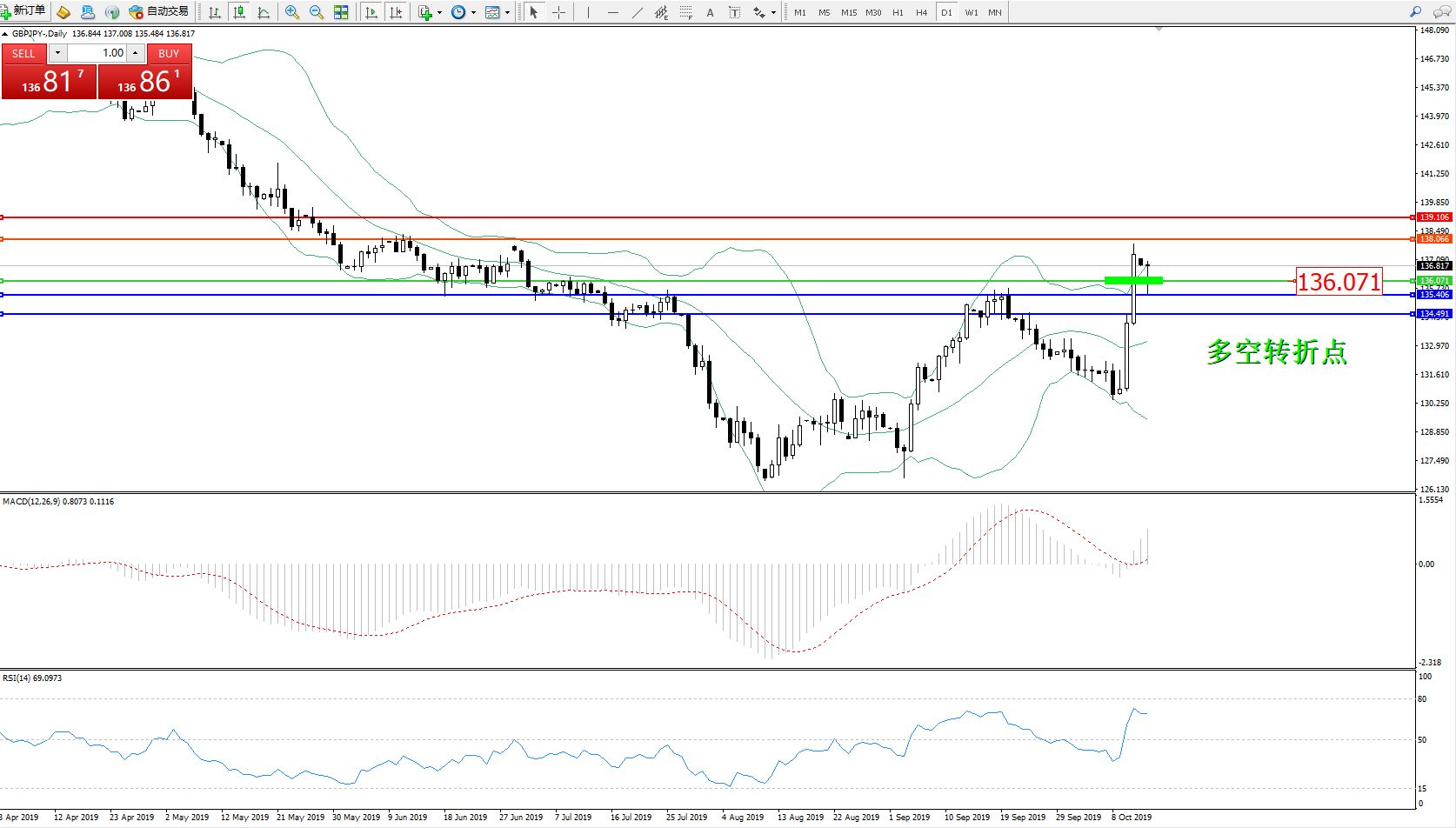 技术点评:急速上攻突破布林带上轨后出现震荡回撤走势,虽有急速回归至布林带指标内侧迹象,但多头仍处于强势,再次拉升,且布林带指标张口态势良好,MACD指标维持0轴线上方持续上扬,RSI指标处于多头区域快速拉升后高位出线平移走势;