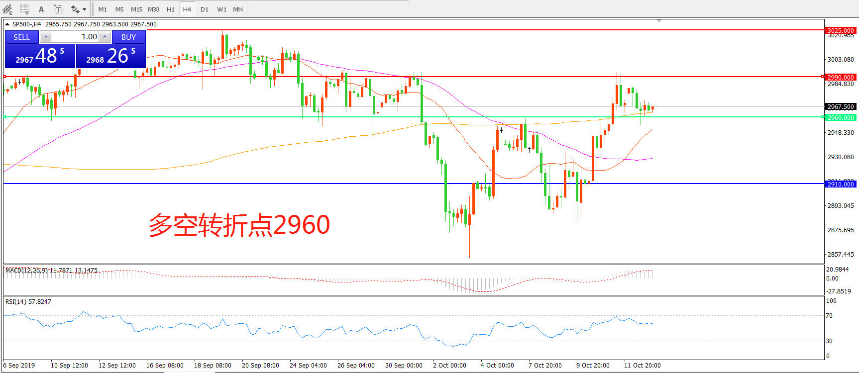 4小时图看,标普500呈现宽幅震荡形态2990附近阻力阻力较强,但整体依然收于2960之上,均线系统逐渐走平,MACD红柱缩短,RSI指标走平,日内延续震荡概率较大。