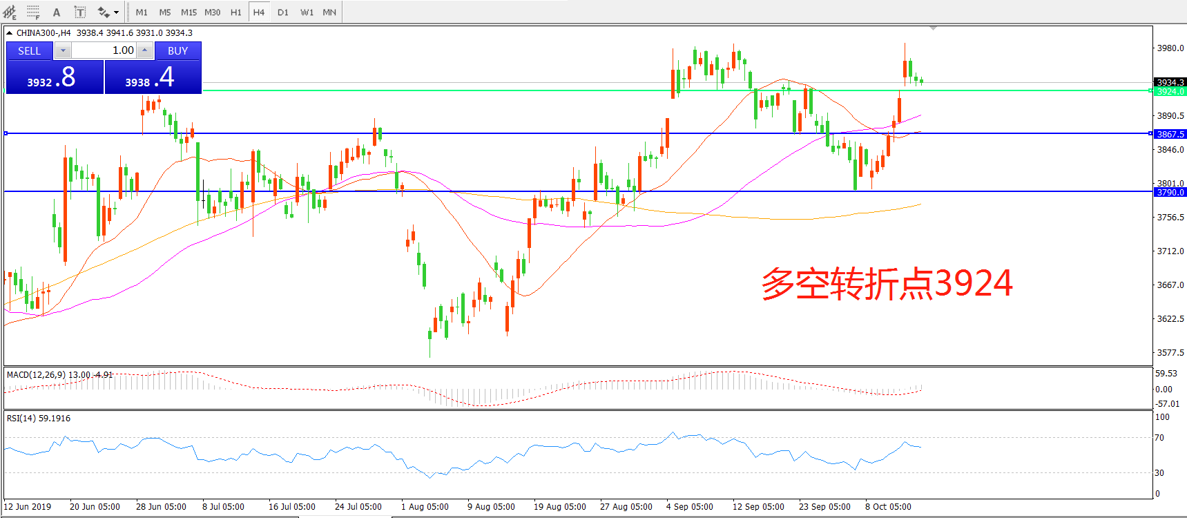 4小时图看,沪深300高位震荡调整,再次回到3924附近,短期走势调整不改涨势,均线系统走平,MACD绿柱缩短,红柱增加,RSI指标向下,日内延续上行概率较大。