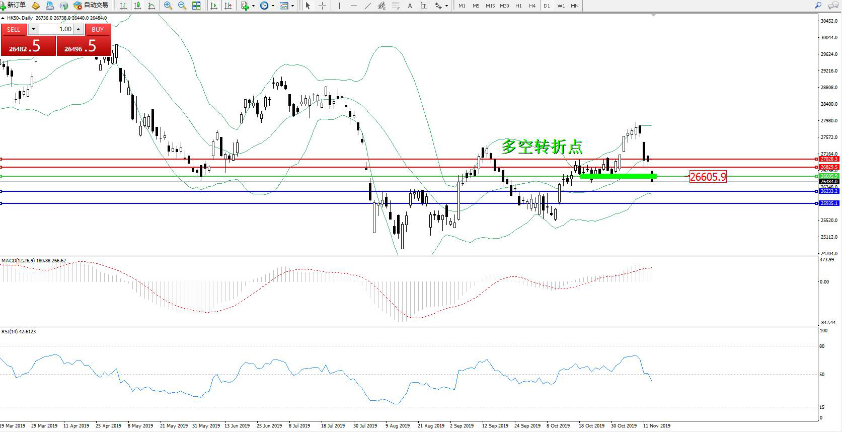 香港恒生指数11月13日(周三)收盘下跌493.82点,跌幅1.82%,报26571.46点;港股4天大跌1300点 空头力量增180%!千亿“南水”力撑 香港最大ETF也有动作,教育,其他支援服务,家庭电器,重型基建,软件开发等5个板块跌幅居前,蓝筹股走弱拖累恒指跌超500点,香港特区政府公布今年第三季度经济数据:GDP总值较上年同期下跌2.9%,为2009年国际金融危机以来最大跌幅,今年经济大概率将出现负增长。第二季度下跌0.5%,第三季度跌幅扩大到3.2%,连续两个季度下跌,已符合技术性衰退特征。来自香港金管局的数据显示,除了政府开支,各项数据都在下滑。其中服务输出大幅下滑13.7%。